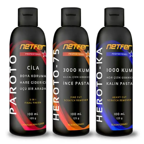 Kullanıcılarımızdan gelen talep üzerine farklı boyutlardan oluşan şişeleri ve bu şişelerle farklı kombinasyonlarda çizik çıkarıcı pasta cila setlerini hazırladık. Bu pakette 100 mL şişelerden oluşan bir adet ince pasta, bir adet kalın pasta ve bir adet boya koruma cilası bulunmaktadır.
